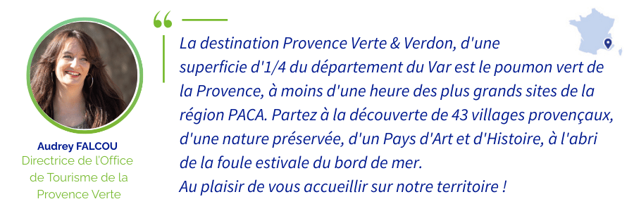 Avant de commencer ce voyage dans le Sud, voici le mot de Mme Falcou, Directrice adjointe de l’Office de Tourisme Provence Verte & Verdon. 🌿